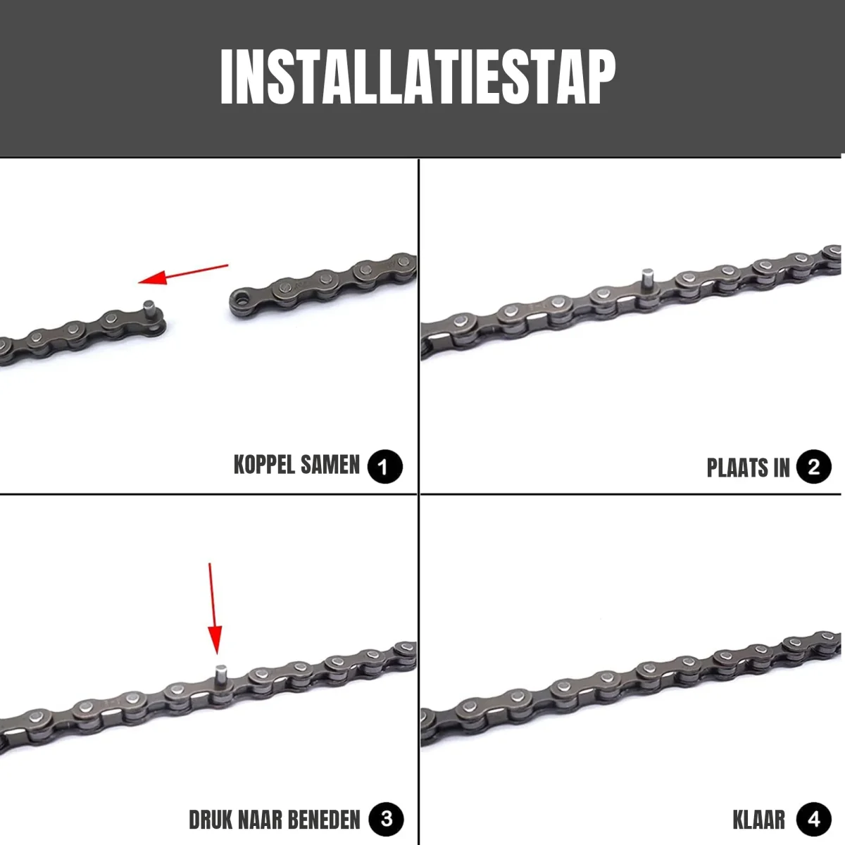 Met de meegeleverde verbindingsschakel bevestig je de ketting snel en veilig. Ideaal als je je fietsketting wilt vervangen stadfiets of op een e-bike fietsketting.