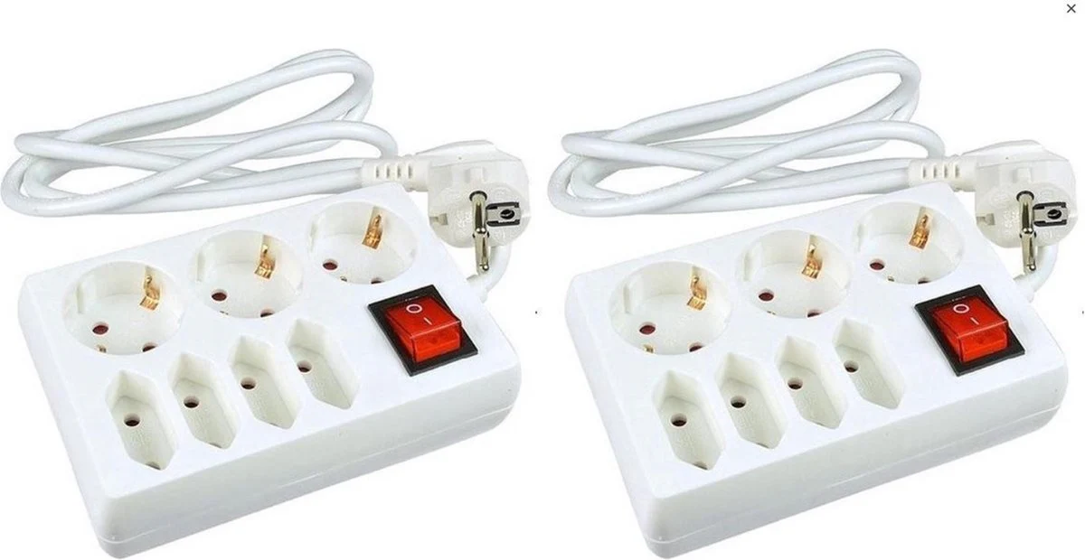 Witte stekkerdoos 7-voudig geaard met schakelaar. Deze stekkerdoos met verlichting in de aan/uit knop heeft 3 stekkers met randaarde en 4 platte stekkers zonder randaarde. Het snoer heeft een lengte van ongeveer 1,4 meter. Deze stekkerdoos is geschikt voor spanning tot 230 Volt. Verlengsnoer met 7 aansluitingen.