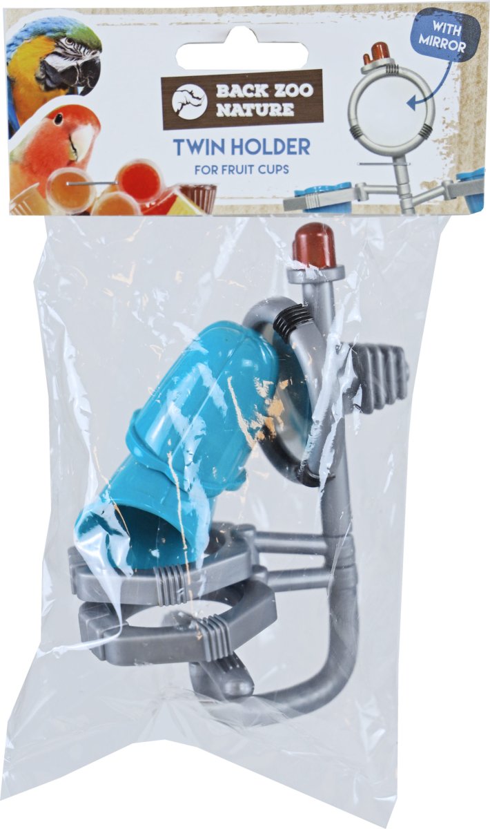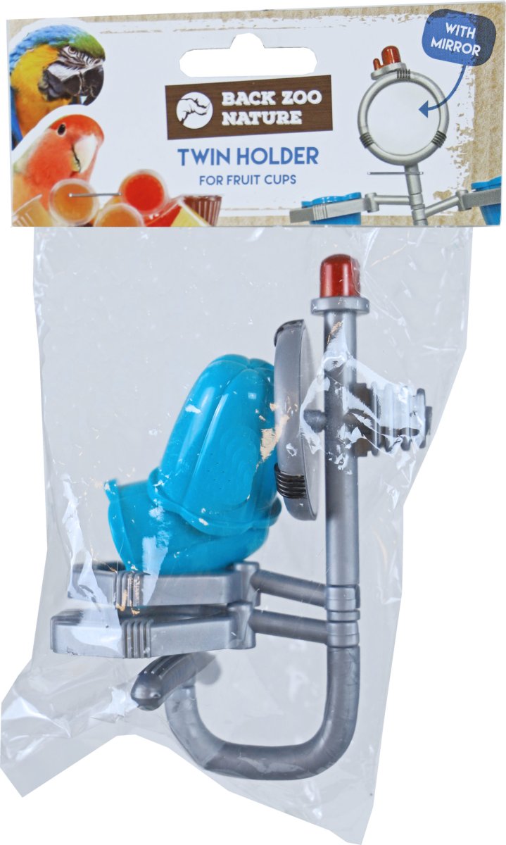 Makkelijke houder voor de populaire fruitkuipjes. Goed te bevestigen op iedere kooi die fijn getralied is. Inclusief spiegeltje. Geschikt voor kleine en grote parkietachtigen. De blauwe ‘dopjes’ vervangt u voor de fruitkuipjes van Back Zoo Nature.