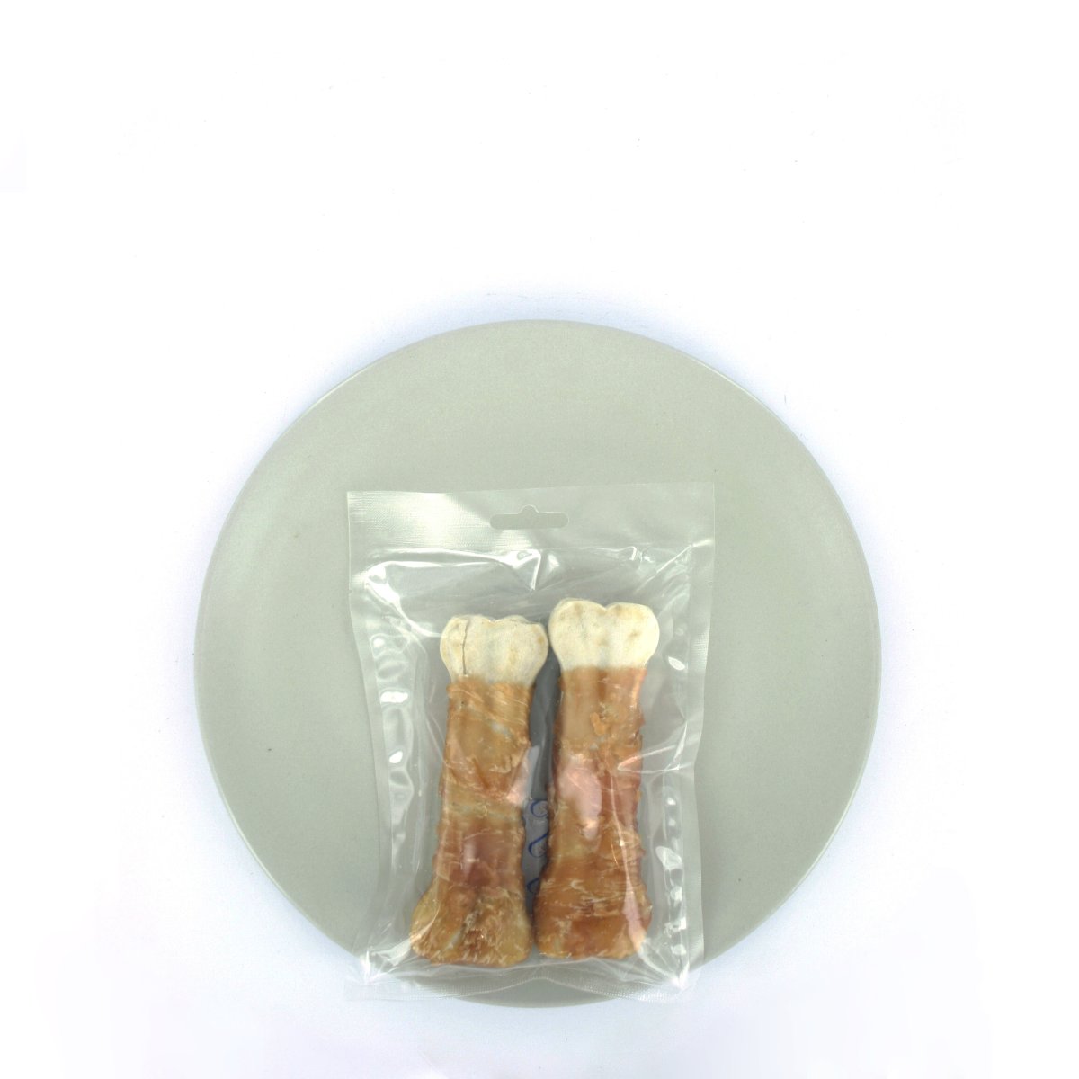 Samenstelling: onderhuids bindweefsel van runderhuid (verbinding tussen huid en dier) geweekt in waterstofperoxide, omwikkeld met kipfilet