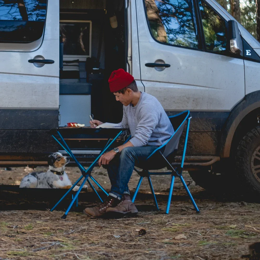 La chaise pliable Cafe Chair de la marque Helinox est idéale pour tous les voyageurs qui souhaitent s’assoir confortablement à une hauteur convenable et à côté d’une table à hauteur standard. En effet, elle a la hauteur d’une chaise de table à manger (hauteur d’assise à 38 cm de hauteur).