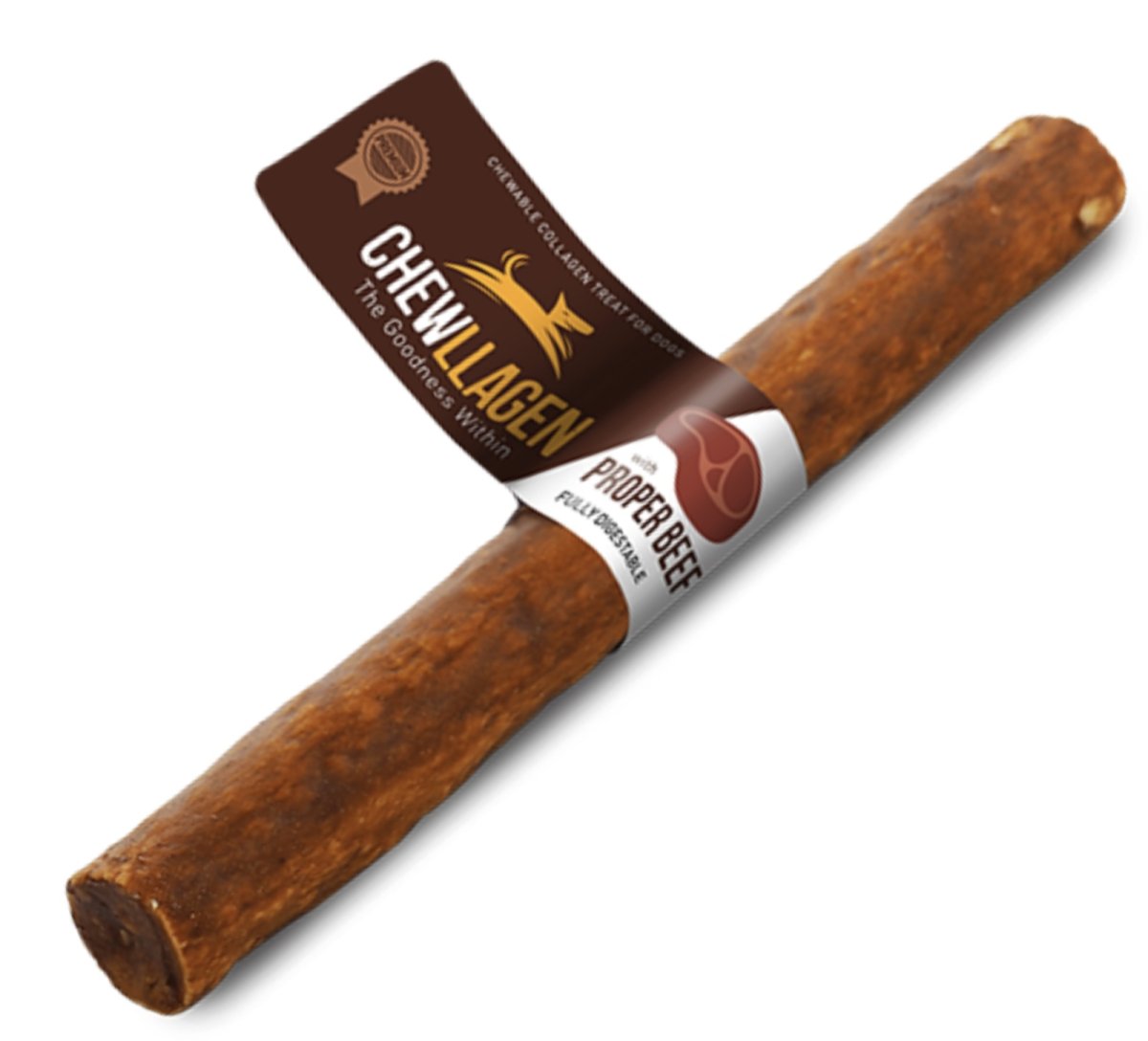 Chewllagen is een hondensnack gemaakt van collageen dat wordt gewonnen uit de huid van Zuid-Amerikaans grasgevoerd rund.