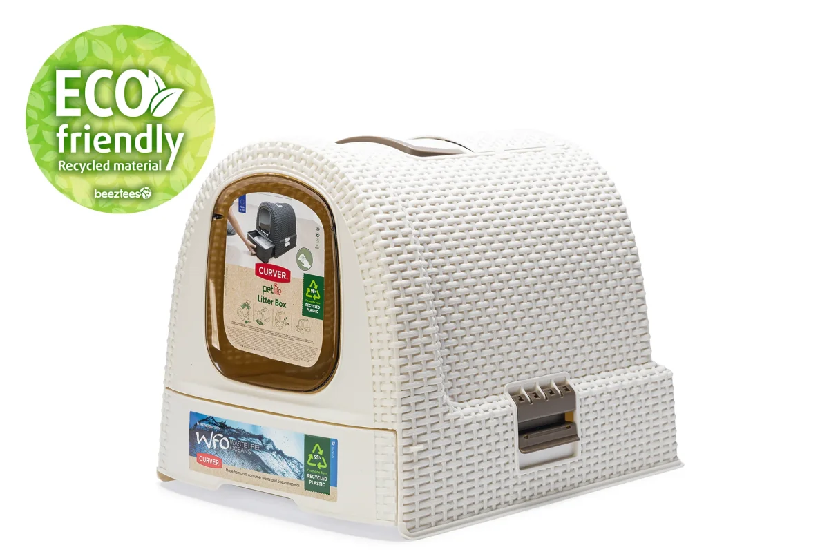Deze Curver Kattenbak bestaat voor 95% uit gerecycled materiaal (huishoudelijk plastic afval en oude visnetten op de bodem van de zee (ocean waste)). De overige 5% zijn nieuwe grondstoffen. De hele kattenbak is op zijn beurt ook weer 100% recyclebaar. De kattenbak heeft een modieuze uitstraling doordat het een motief heeft van gevlochten rattan. De lade aan de voorkant heeft een plateau met gaatjes, waardoor de kat een groot deel van het kattenbakgrit achterlaat in de bak alvorens de kattenbak te verlaten. Door de uitschuifbare lade kan je in een oogopslag zien of de kattenbak aan verschoning toe is. Aan de bovenkant van de kattenbak bevindt zich een klepje waar de kattenbakschep opgeborgen kan worden. De Curver Kattenbak is zo mooi dat je nauwelijks ziet dat het een kattentoilet is.