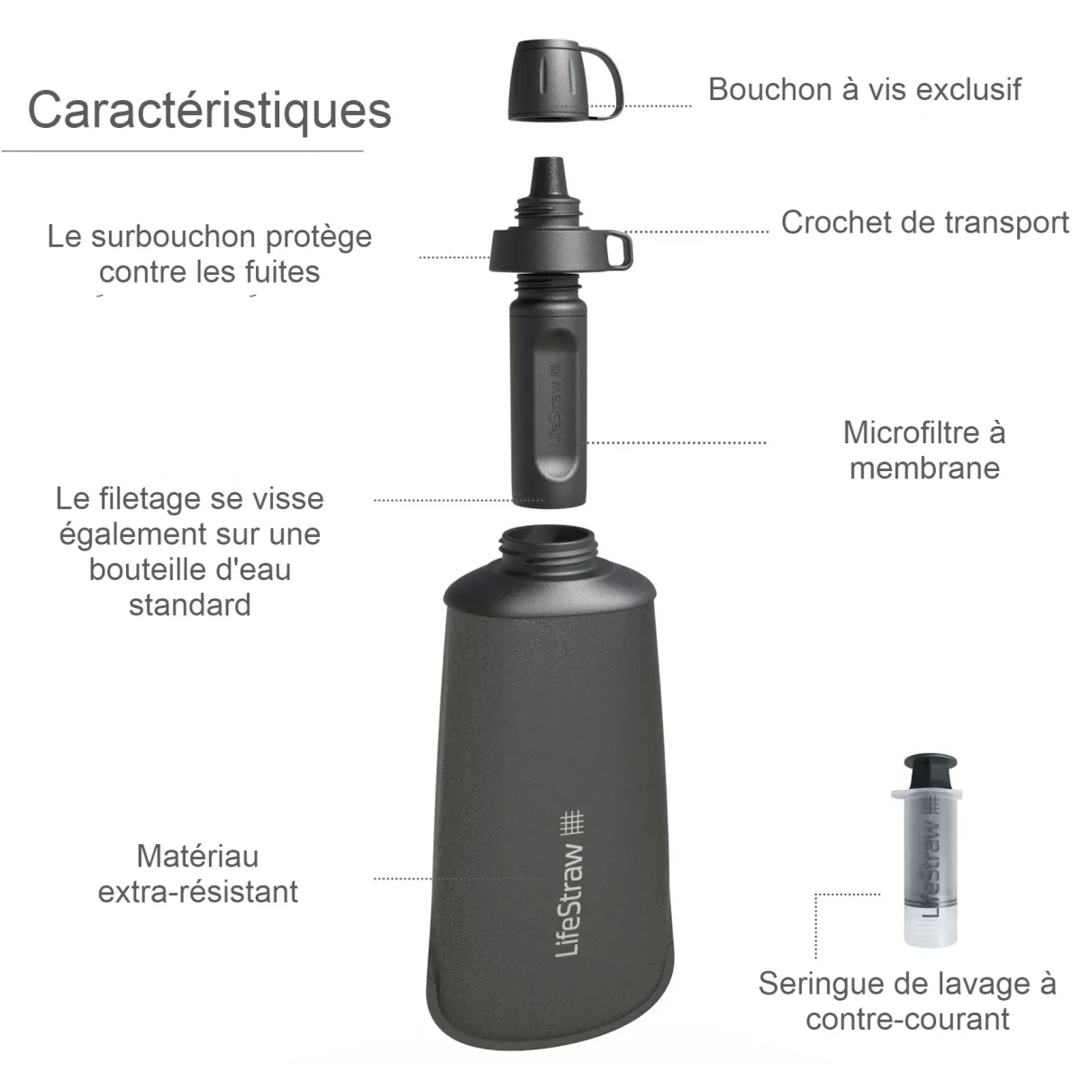 Le filtre permet de filtrer 99.9% des bactéries et parasites pouvant contaminer l’eau et réduit efficacement les maladies infectieuses telles que la diarrhée, la dysenterie et la giardiose. Sa capsule de charbon actif empêche les mauvaises odeurs et ne laisse pas un arrière goût dans l’eau.