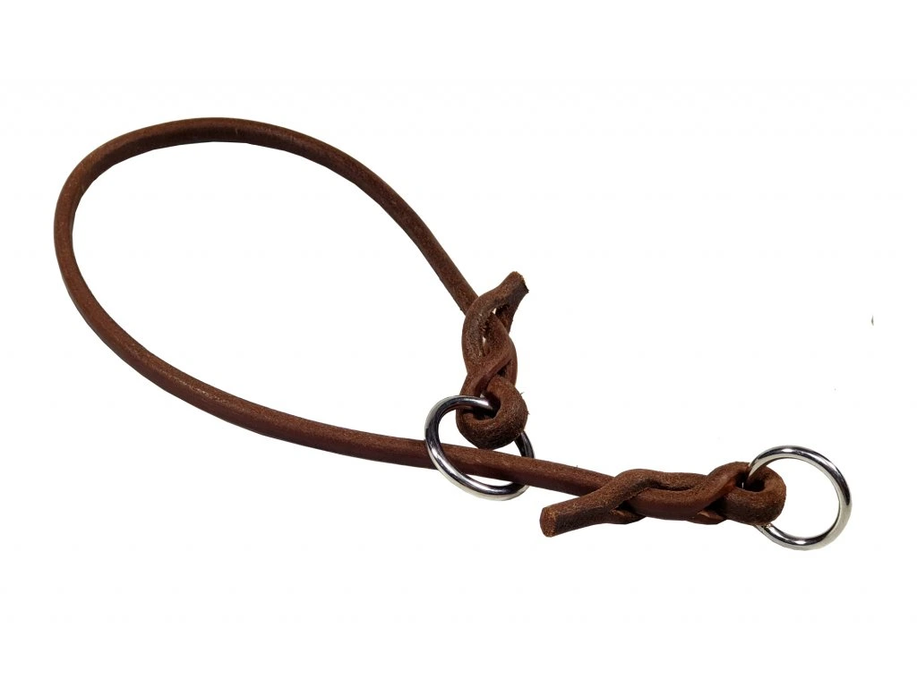 De trekkoordhalsband is gemaakt van stevig rond leer. De gewrichten bij de ringen zijn strak in elkaar verstrengeld. De halsband is geschikt voor middelgrote en grote rassen.