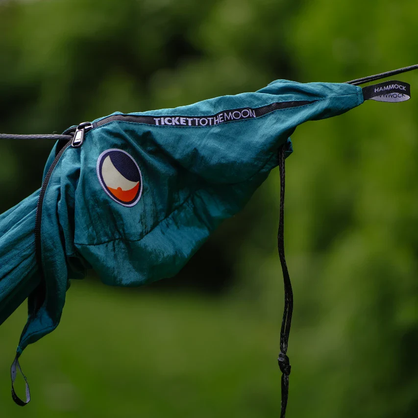 Pour attacher le hamac encore plus facilement, Ticket To The Moon propose aussi des sangles d’attache, des mousquetons et une pochette de rangement suspendue vendus séparément.