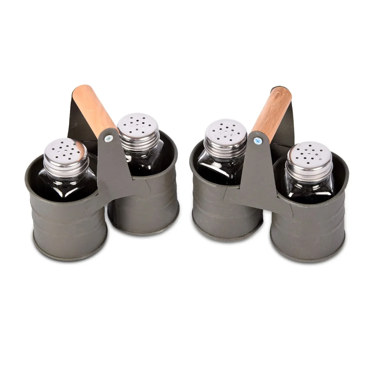 Onze peper- en zoutmolen set is een prachtige aanvulling op elke keuken. Met hun elegante donkergrijze kleur passen deze keukenmolens perfect in elk interieur. Deze set bevat twee stuks molens en vier strooiers, verpakt in een handige houder.