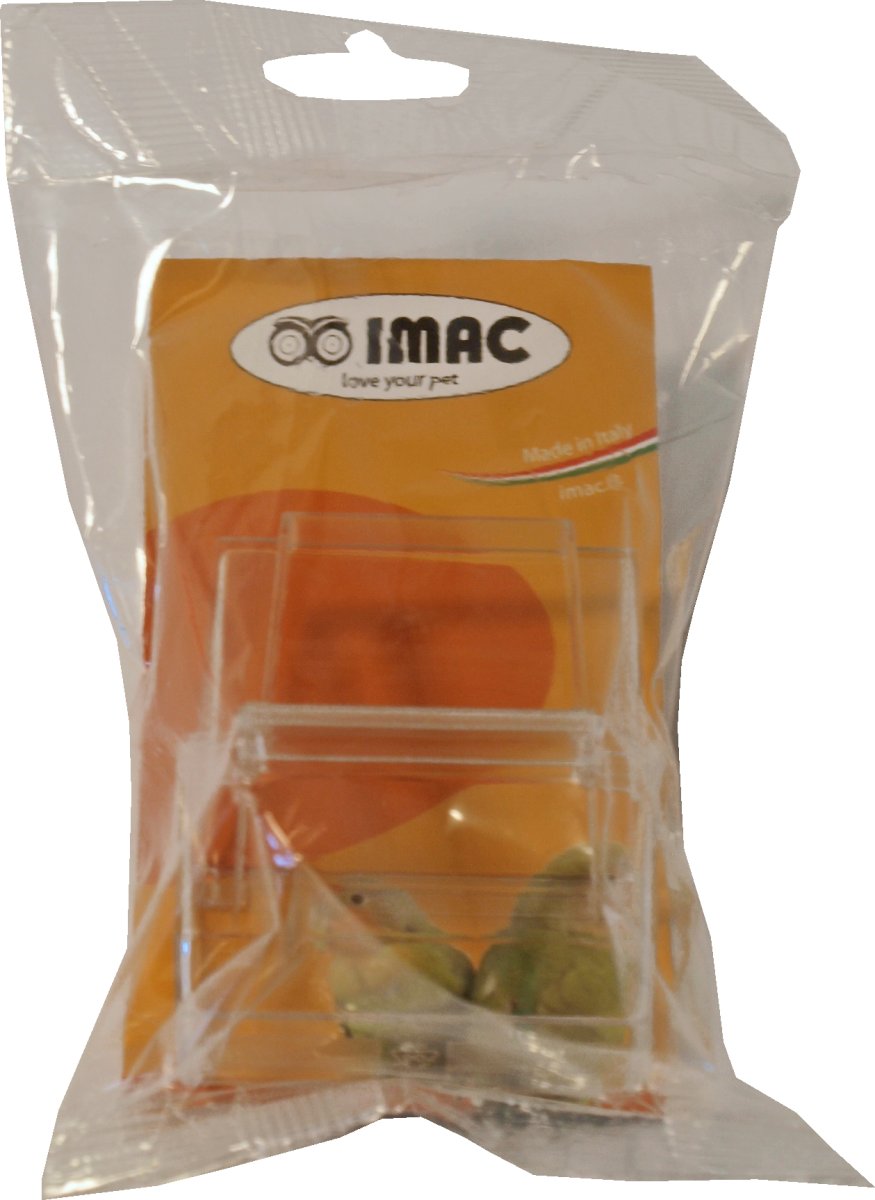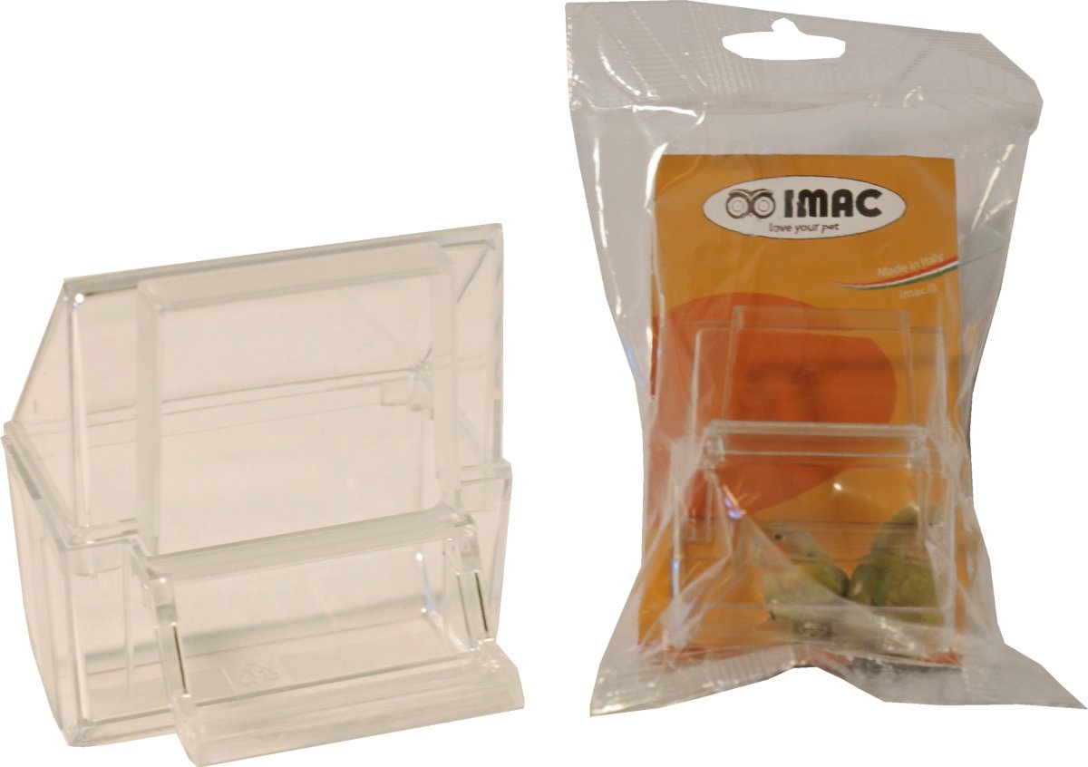Imac plastic kapbakje transparant. Met dit kapbakje kunt u uw vogel voorzien van bijvoorbeeld snoepzaad, eivoer of grit. Zit in een handige ophangverpakking.