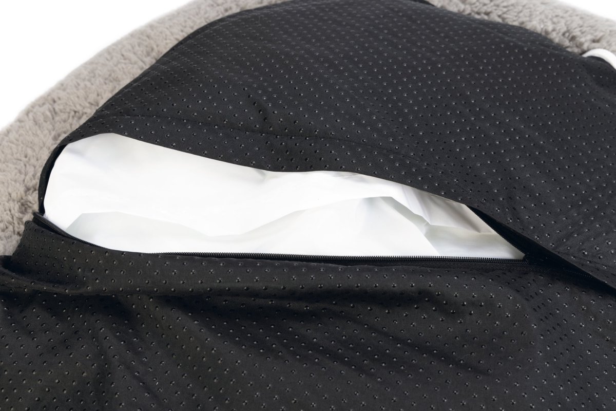 Deze mand heeft twee hoezen, een binnenhoes en een buitenhoes. De buitenhoes is uitwasbaar op 60 graden en de waterdichte kussenhoes is uitwasbaar op 30 graden. Daarnaast is de onderkant van het kussen gemaakt van een antislip stof, zodat de mand goed blijft liggen.