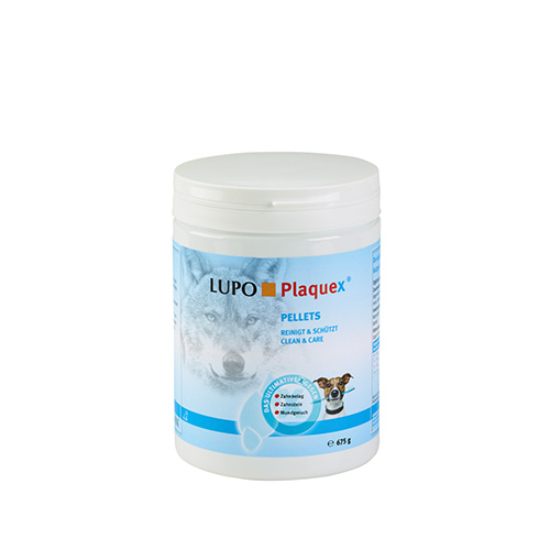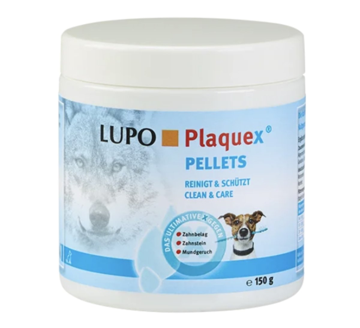 De combinatie van natuurlijke ingrediënten in de vorm van een pellet ondersteunt eenvoudig en effectief de tandverzorging van uw hond. Plaquex is een nieuwe formule voor actieve ingrediënten, ontwikkeld voor de mondverzorging van uw hond. Door regelmatig bij te voeren met LUPOSAN Plaquex wordt bestaande tandplak verminderd en wordt de vorming van nieuwe plaque tegengegaan. Het vermindert ook slechte adem en verzorgt het tandvlees.