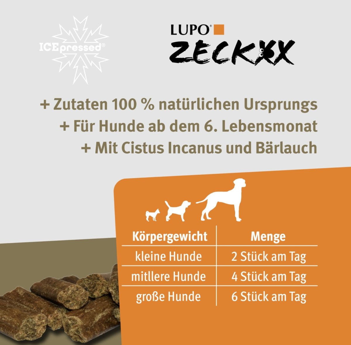 Onze LUPO® ZECKXX Snack bevat een speciale selectie van ingrediënten van natuurlijke oorsprong, die