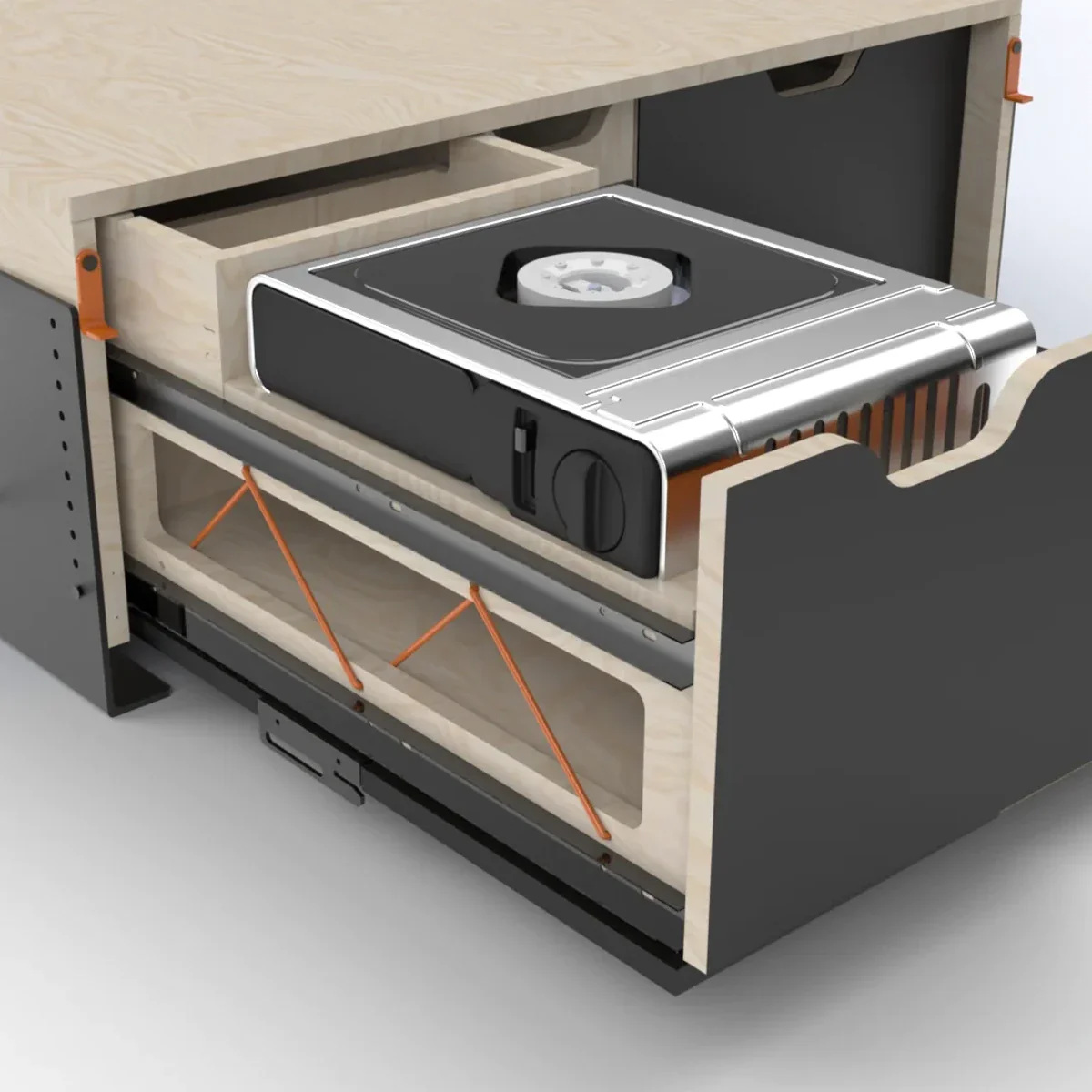 L’espace de vie modulable comprend une table amovible et réglable pour les déjeuners et dîners sur les routes, un couchage en lit peigne 1 ou 2 places (en option) pour dormir confortablement dans votre véhicule et des tiroirs de rangement pour ranger tous vos accessoires et équipements.