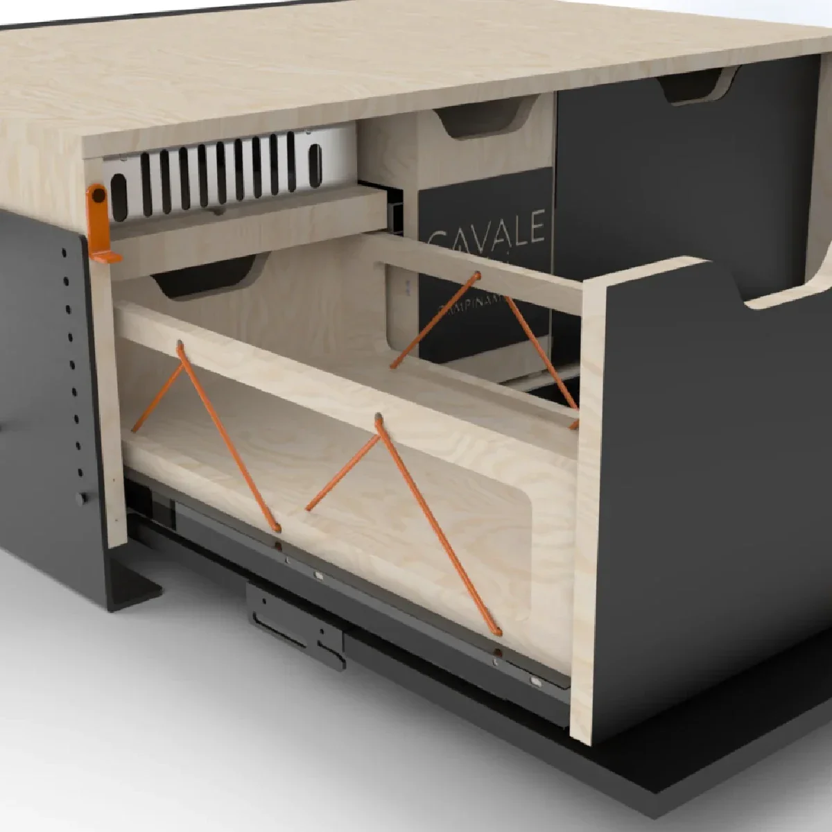 La malle de voyage Cavale a un design très ingénieux et modulable. Sa conception offre une cuisine intégrée ainsi qu’un espace de vie modulable.