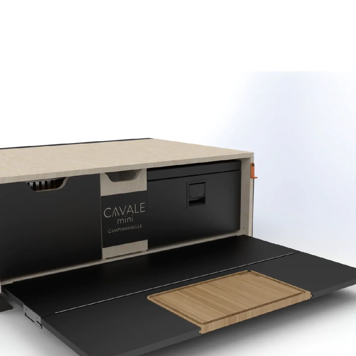 Le kit d’aménagement amovible Mini Cavale, de la marque française Campinambulle est une malle de voyage amovible et compacte qui s’installe très facilement dans le coffre de votre véhicule. Vous pouvez ainsi transformer votre véhicule en un véritable van aménagé modulable.