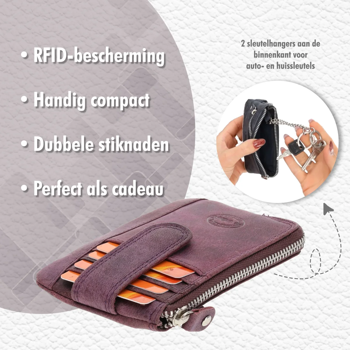 Of je nu een weekendje weg gaat of een dagtocht maakt, deze portemonnee met ritssluiting houdt alles veilig en binnen handbereik. De twee sleutelringen aan de binnenkant zorgen ervoor dat je sleutels altijd bij de hand zijn, wat deze sleuteletui nog handiger maakt.