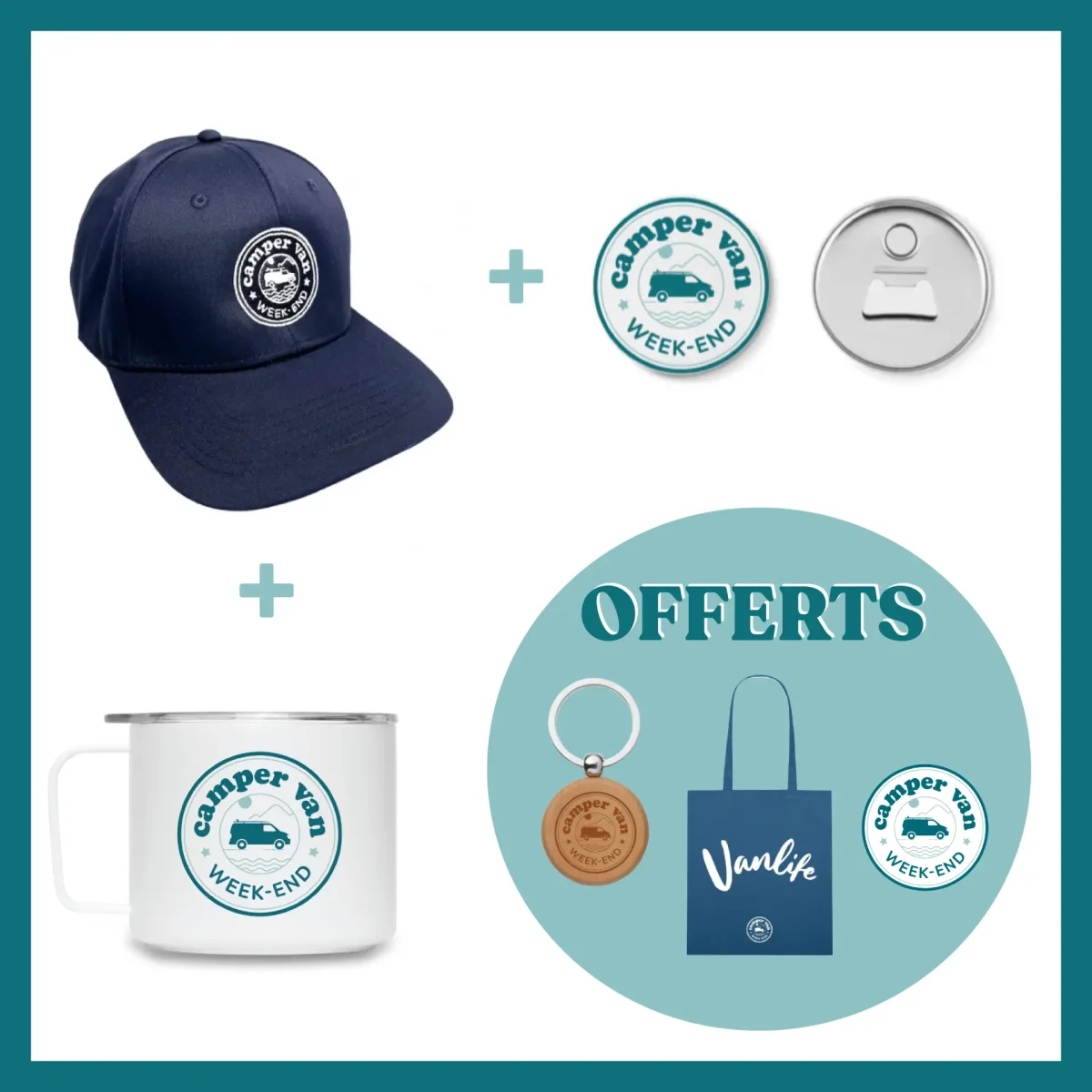Le Pack Souvenir Deluxe du Camper Van Week-End regroupe des accessoires pratiques pour les vanlifers, parfaits pour la vie nomade en fourgon, van aménagé ou en camping-car :