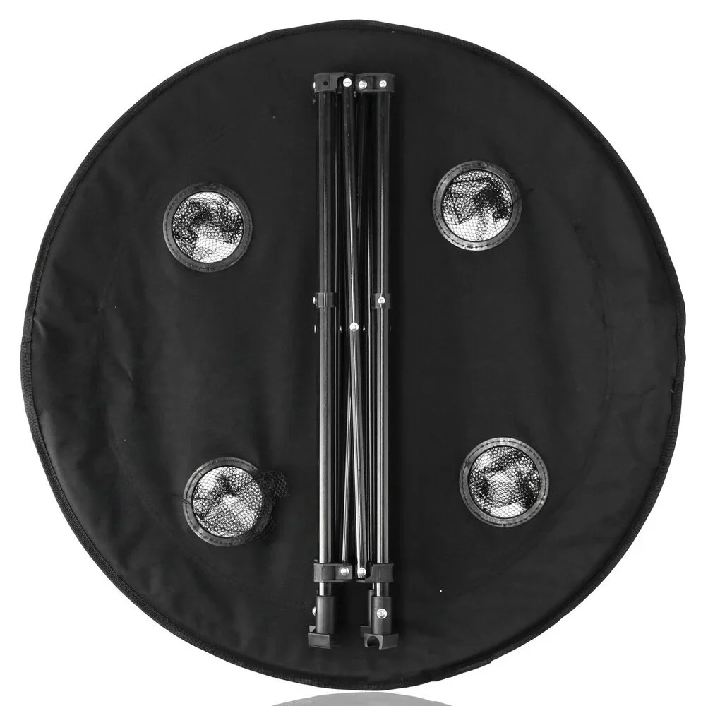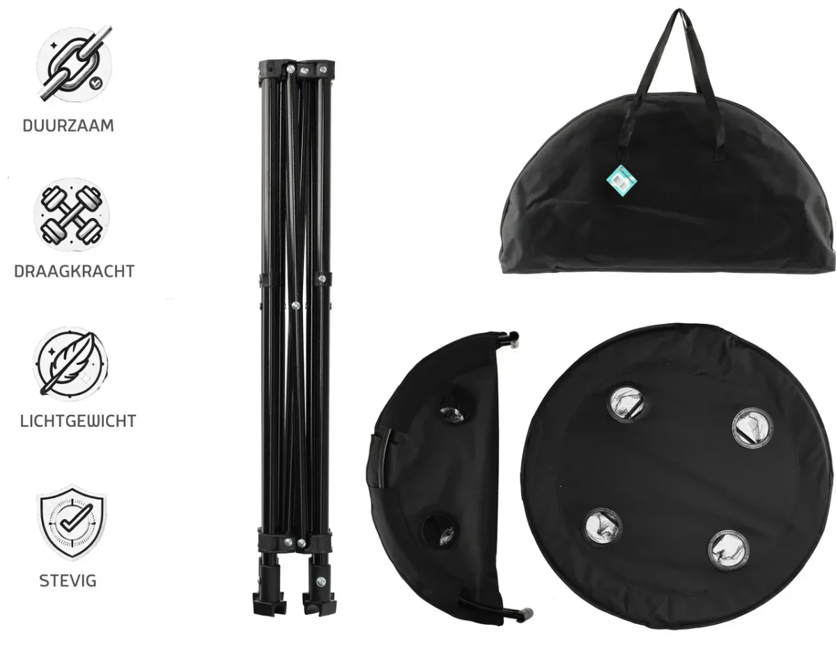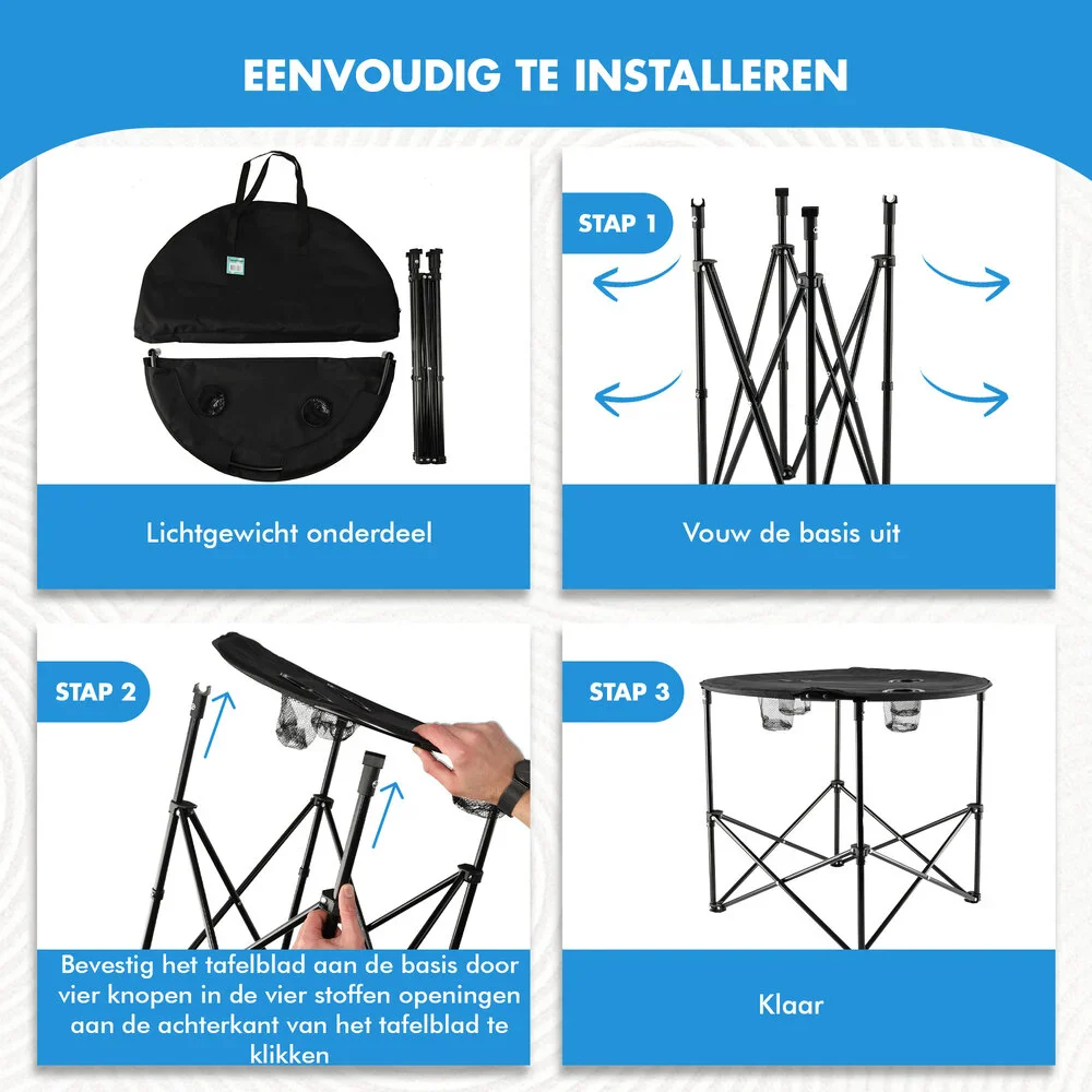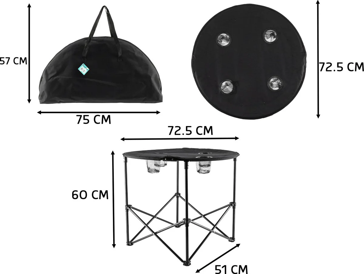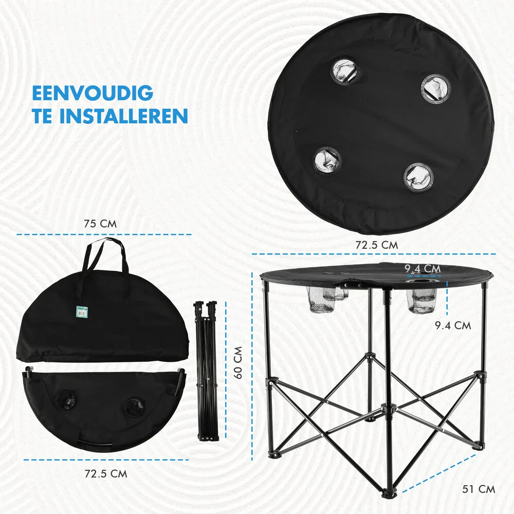 - Compact en Opvouwbaar: Met een diameter van 72,5 cm en een hoogte van 60 cm is deze ronde picknicktafel voor 4 personen gemakkelijk op te bergen en mee te nemen.
