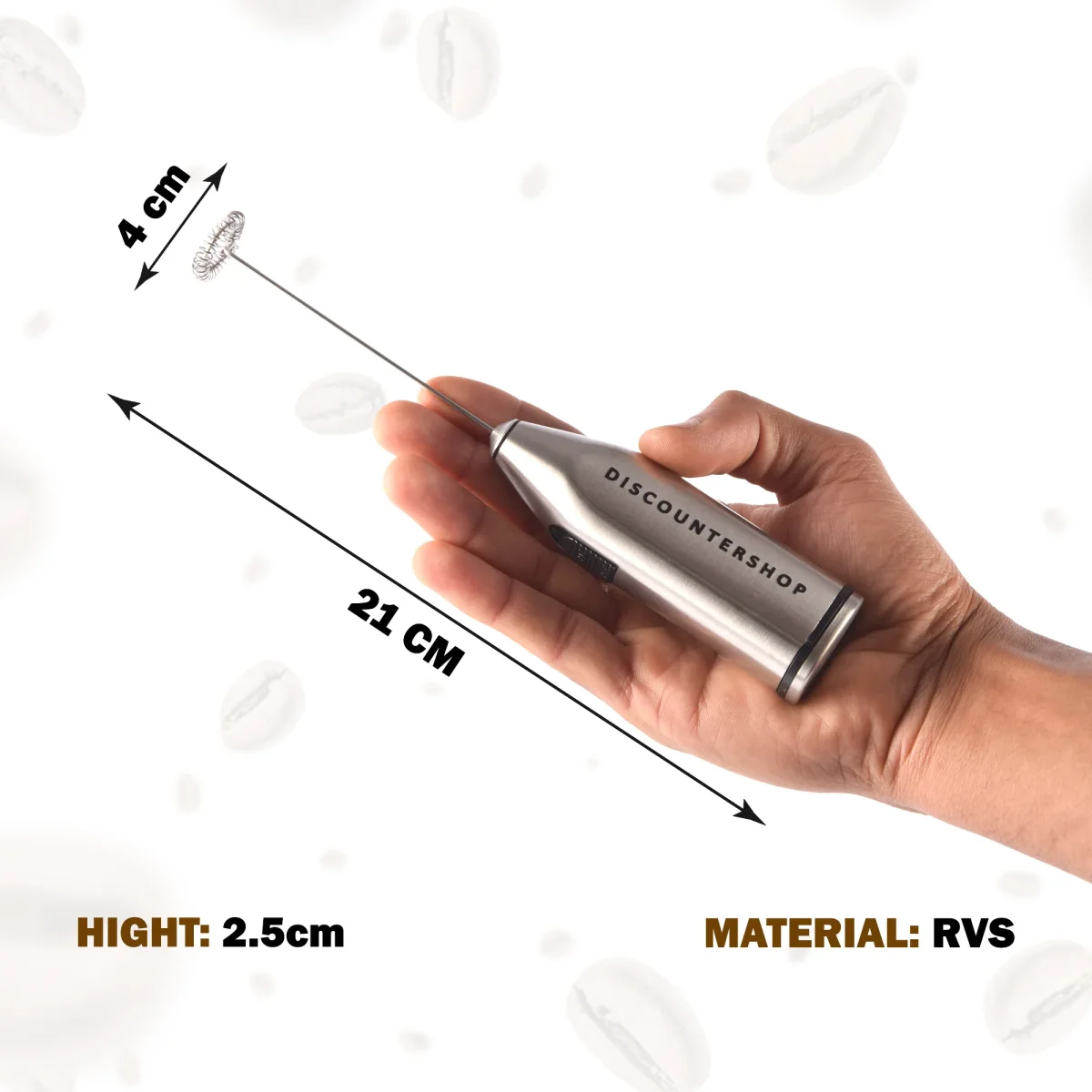 Voor de perfecte cappuccino of latte macchiato is onze melkopschuimer de ideale keuze. Dit apparaat, met een lengte van 21 cm en gewicht van 115g, is compact en efficiënt. Uitgevoerd in stijlvol zilver met zwart en gemaakt van duurzaam RVS, werkt het op 2xAA 1.5V batterijen (niet inbegrepen). Perfect voor elke koffieliefhebber die thuis barista-kwaliteit wil bereiken.