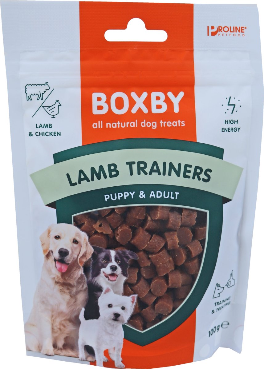 Proline Boxby lamb trainers is energierijk, ideaal voor training en als tussendoortje, glutenvrij, kleine zachte traktaties, goed voor de spijsvertering. Inhoud: 100 gram.