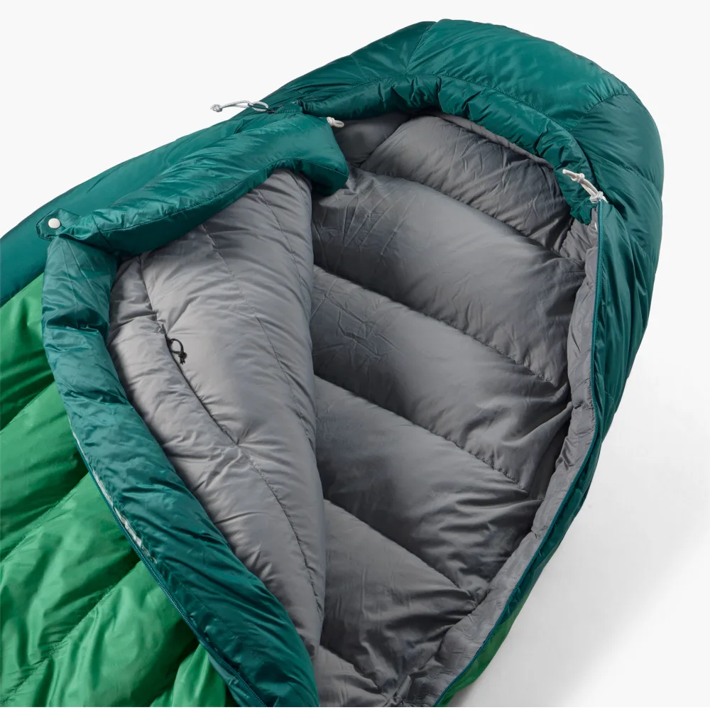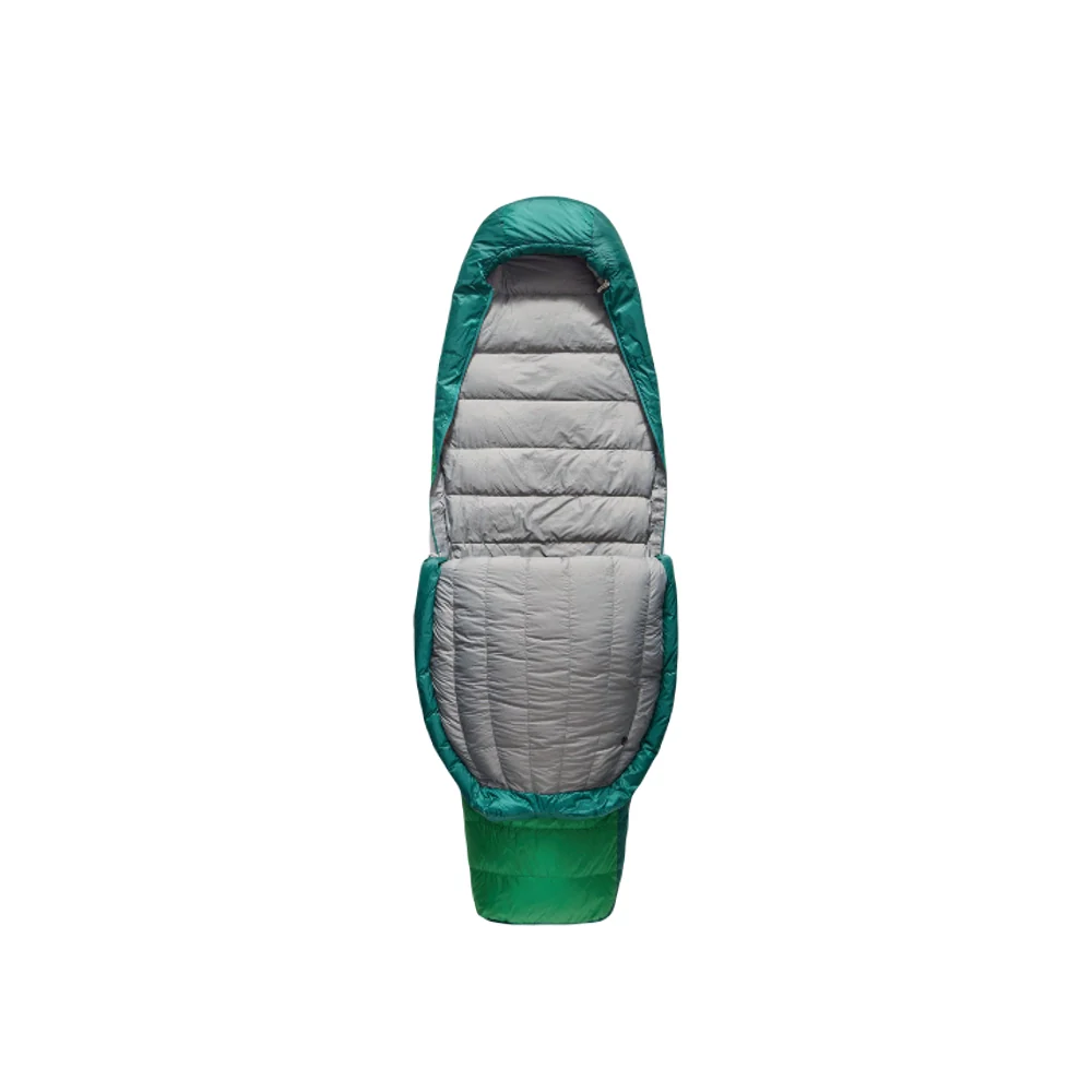 - Un fermeture éclair au niveau des pieds permet d’ouvrir entièrement le sac pour une utilisation en quilt, offrant une aération supplémentaire ou une plus grande liberté de mouvement.