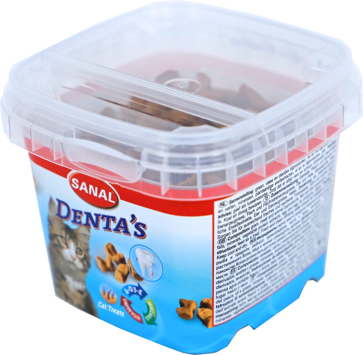 Sanal Denta’s is een heerlijke, krokante traktatie dat tevens het gebit en tandvlees van je kat helpt verzorgen. Verpakt in een handige en hersluitbare cup waardoor het product langer vers blijft.