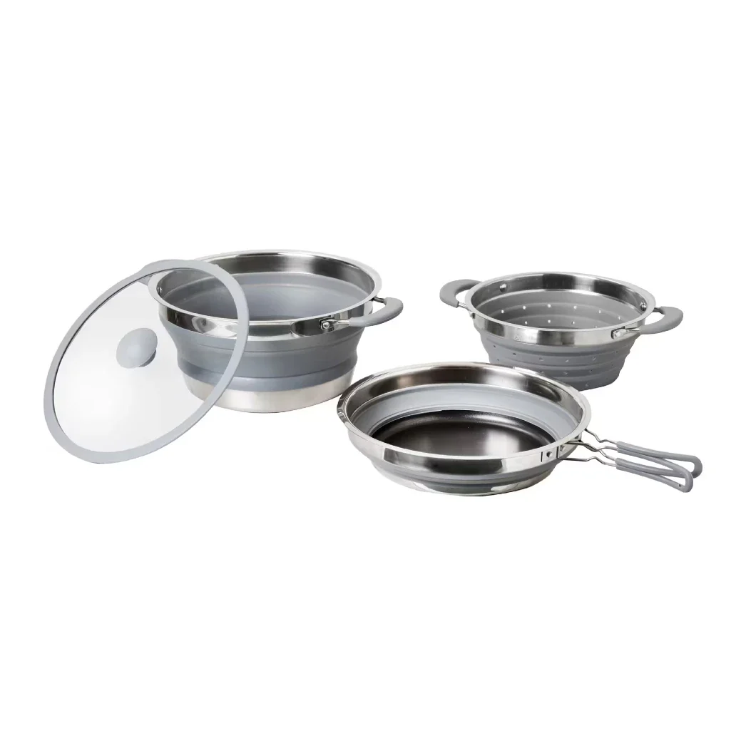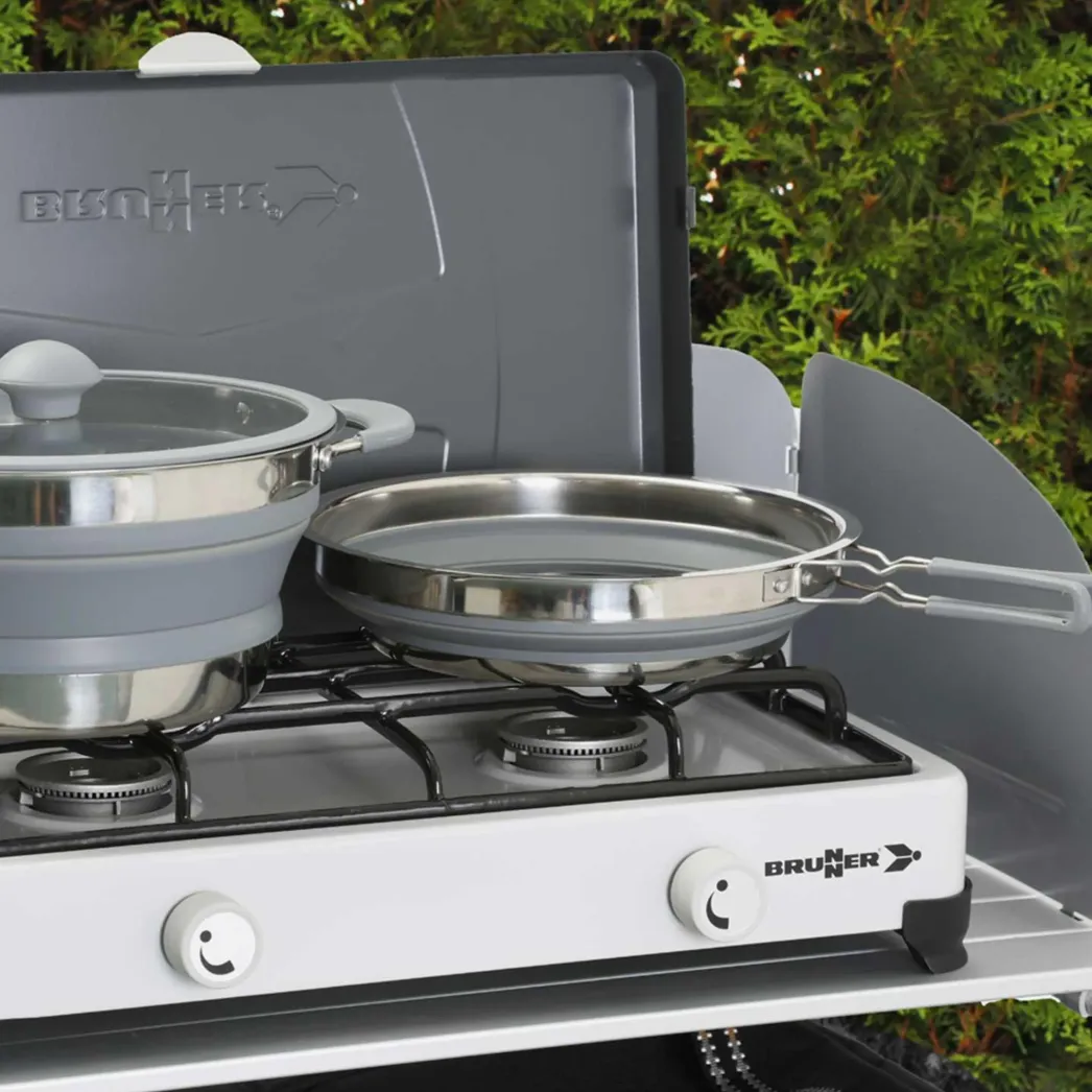 Le set de casseroles 4 pièces Volcano de la marque Brunner est un ensemble de cuisson pliable combinant inox et silicone, conçu pour les road trips, la vanlife et le camping.