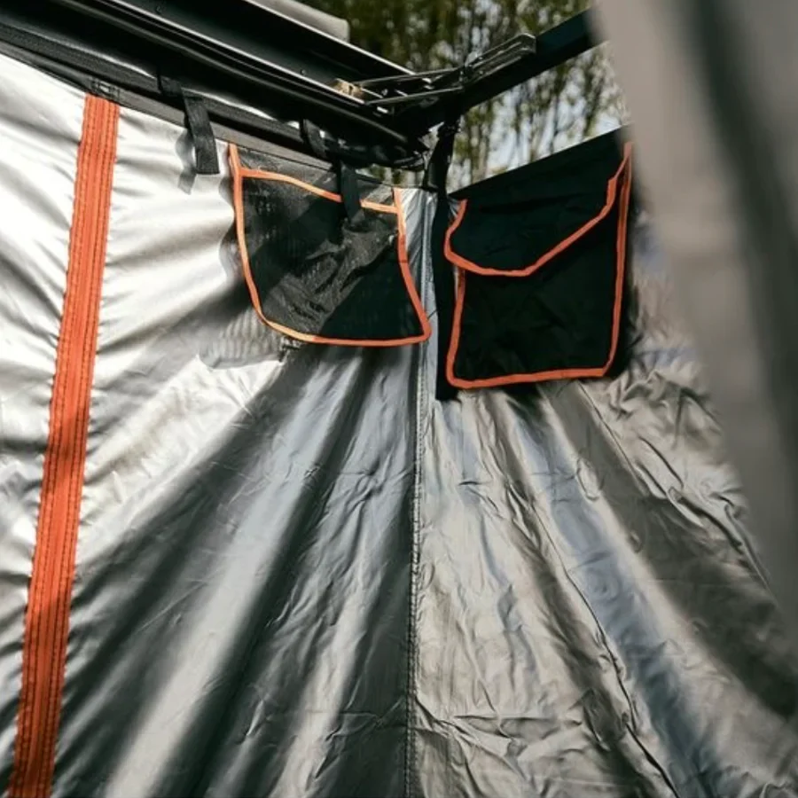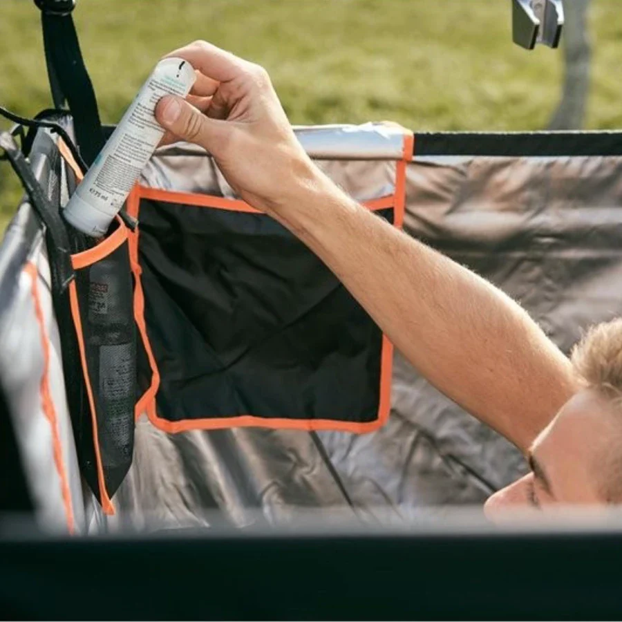 Avec son opacité absolue, la tente de toit offre une grande intimité et praticité. Vous pouvez vous doucher, vous changer et vous mettre à l’abri des regards. Elle est également équipée de deux poches de rangement en hauteur pour garder votre nécessaire de toilette à portée de main.