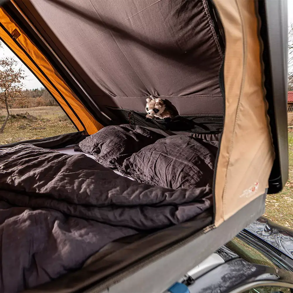La tente de toit Hussarde Duö a aussi été conçue avec une toile respirante et imperméable. Son système d’aération ultra performant, une ventilation passive brevetée, permet une très bonne évacuation de la condensation.