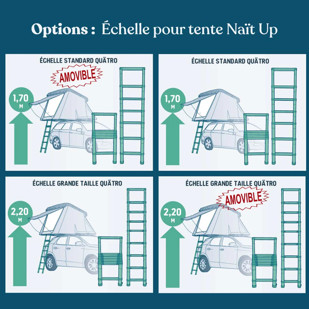- Échelle mobile de très grande taille (M3.2)(+249€) : Échelle télescopique à micro-pas de réglage de très grande taille pour véhicule jusqu’à 2.90 m (avec verrouillage anti-vol.). Nécessite une accroche échelle (sauf pour le modèle Family déjà inclus). Compatible Hussarde Duö, et accès fenêtre Quatrö/Family/TriUp. Livrée avec l’échelle fixe standard (ne remplace pas une échelle de plancher basculant.)