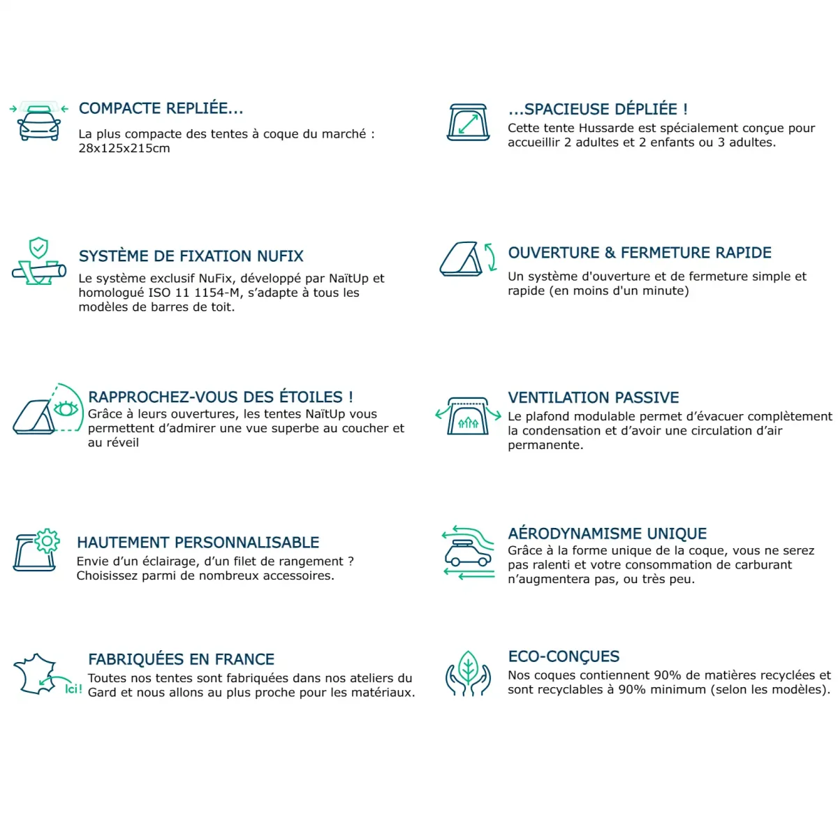La tente de toit Hussarde Quatrö de Naït Up peut se personnaliser afin de s’adapter au mieux à vos besoins, à votre véhicule (voiture, van ou fourgon aménagé) et votre façon de voyager.