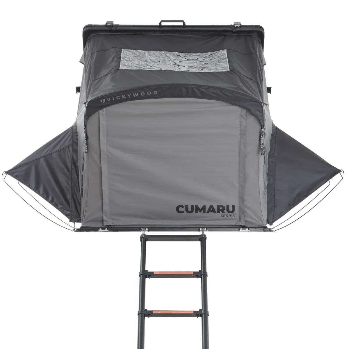 La tente de toit Vickywood CUMARU EASE 135 est l’équipement de bivouac nouvelle génération par excellence, offrant un volume intérieur décuplé grâce à sa charnière en X et une étanchéité de 5 000 mm pour vos road trips.