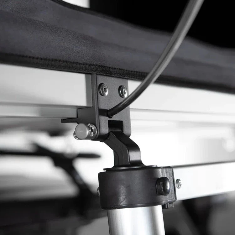 Sur le panneau d’extension se trouvent des attaches afin que vous puissiez mettre vos rangements extérieurs ou vos rangements chaussures et également deux passe-câbles pour passer vos câbles électriques de l’intérieur à l’extérieur de la tente de toit.