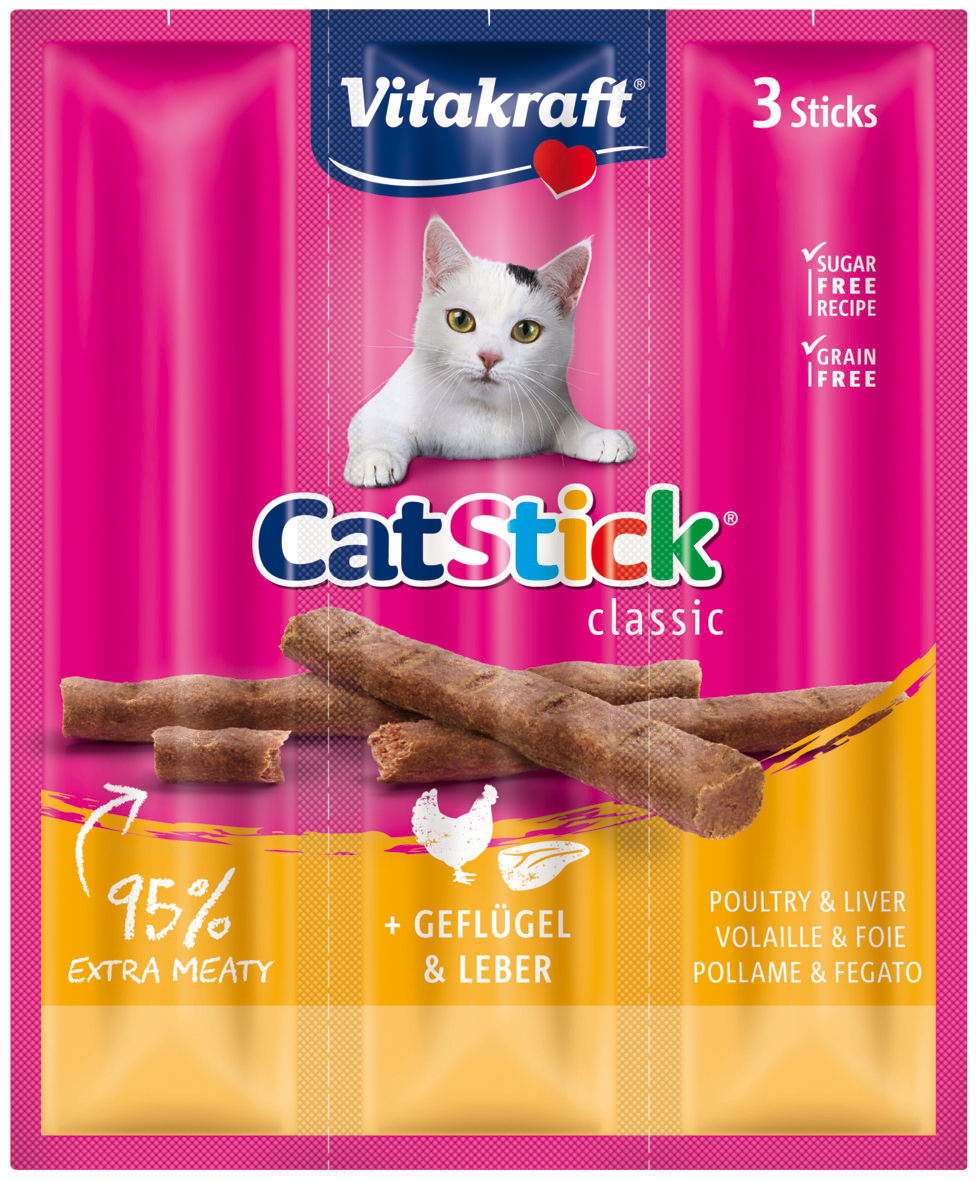 Drie heerlijke, zachte, individueel vers verpakte beloningssnacks met een extra hoog vleesgehalte van maar liefst 95% waar elke kat gek op is. Door de voorgeprepareerde groeven is de Cat-Stick eenvoudig in stukjes te breken.