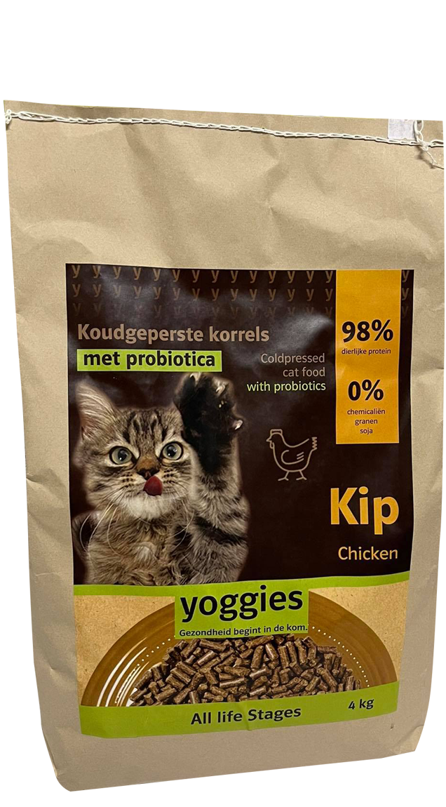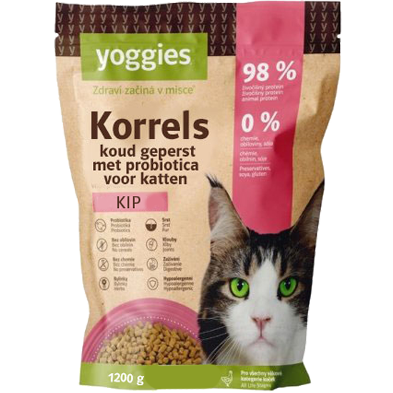 Yoggies koudgeperste kattenbrokjes met kip bevatten unieke probiotica ter ondersteuning van de immuniteit en de algemene gezondheid van katten. Ze vormen een alternatief voor voornamelijk vleesgevoerde katten en kunnen dienen als een hoogwaardige vorm van volwaardig kattendieet , dat af en toe kan worden aangevuld met rauw vlees.